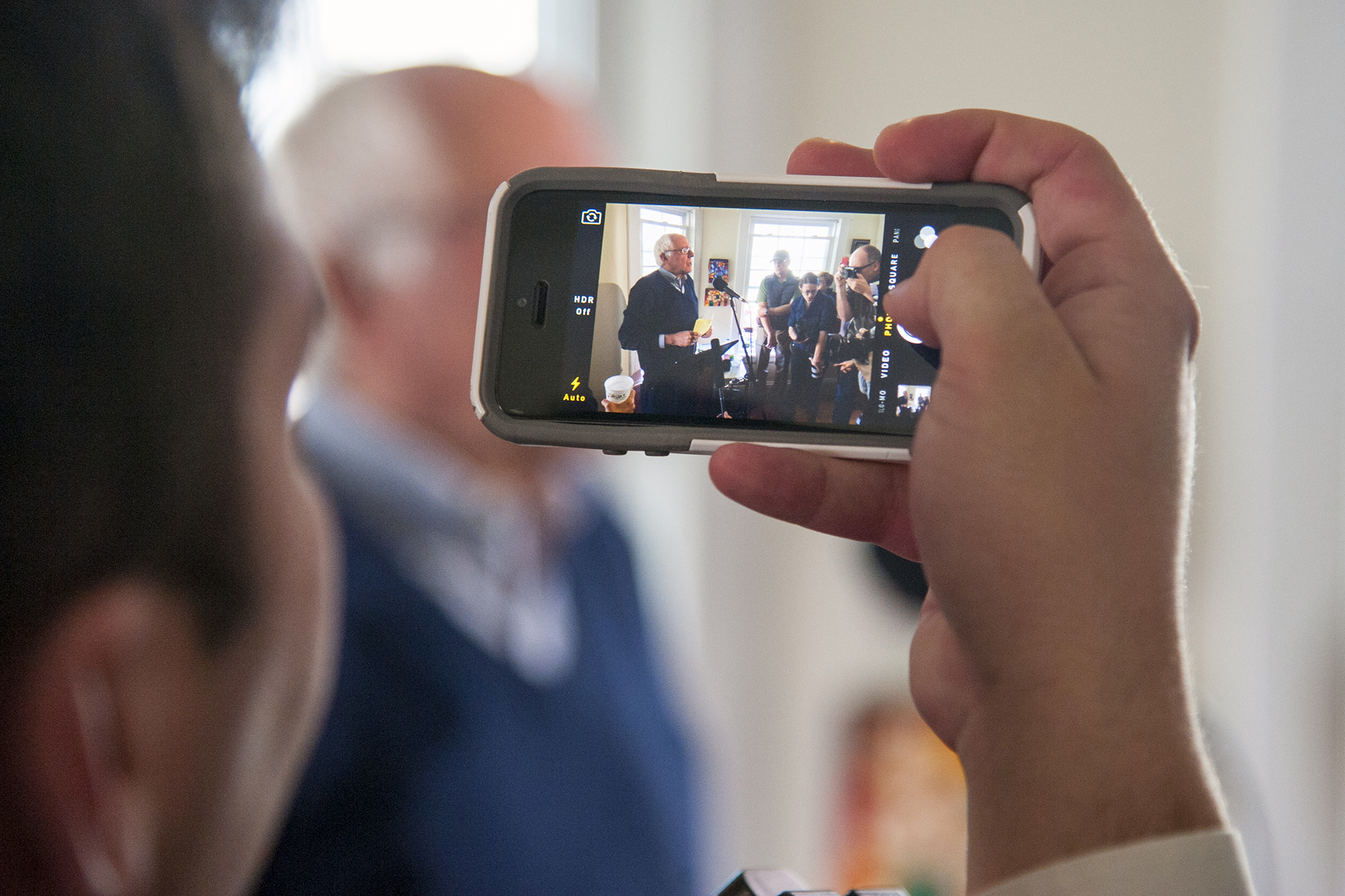 Bernie Sanders of Vermont is shaking up the Democratic primary with a grassroots campaign that is taking on the special interests and billionaire donor class. Among other things, he is also pressing for: breaking up the big banks, free education, lessening income inequality, and undoing the Citizens United decision with a Constitutional amendment. These photos were taken at an home gathering in Hanover, NH before he was an official candidate and one in Manchester, NH just after his formal announcement. In Hanover, Bernie arrived to speak with about 20 of us with his driver and campaign director, Nick Carter at the home that was marked by signs left over from his last senate campaign. In Manchester, just a few weeks later, there were 10x as many people and the signs were homemade. If you want to help, go to https://berniesanders.com